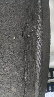Late in the race, I notice a bit of a tire shudder as I come thru "off-ramp" - one of the tight "fish-hook" turns. After I come off the track, I notice that I have worn one of my Hoosier tires down to the steel cords.